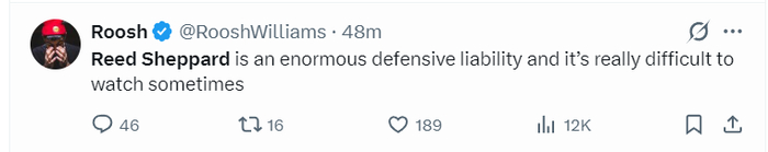 休媒疯狂朝着谢泼德开炮,Roosh:里德-谢泼德是个超级的防守漏洞,有时看着他打球真是让人难受。