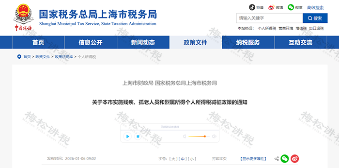 1月6日,上海税务局发布《关于本市实施残疾、孤老人员和烈属所得个人所得税减征政策的通知》。