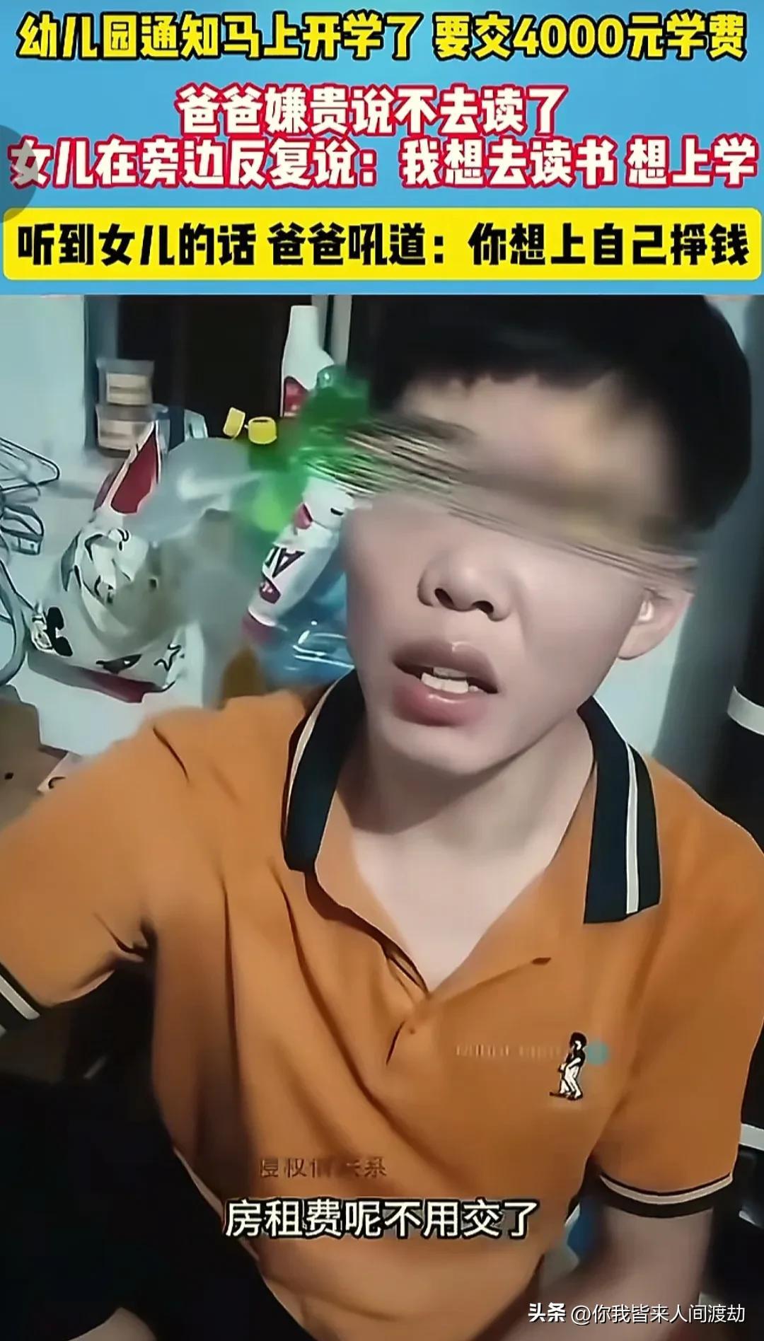 这件事情的起因是广东有一名女子问自己的丈夫要女儿的学费,女儿在幼儿园读书一学期大概要交4000元的学费,但是就这4000元孩子的爸爸都不想出这位父亲明确表示不想给女儿交费,认为女儿读不读幼儿园的无所谓还不如把这笔钱拿来交房租,但是旁边的女儿听到爸爸不让自己读书便立马插嘴说:我要想去读书,想上学。但女儿的话也彻底激怒了父亲,父亲大声的吼道:你想上学,你自己去挣...