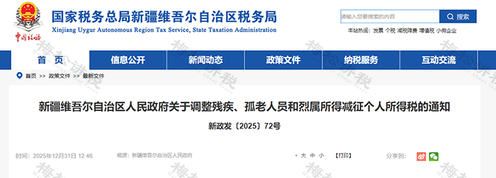 2025年12月31日,新疆维吾尔自治区税务局发布《新疆维吾尔自治区人民政府关于调整残疾、孤老人员和烈属所得减征个人所得税的通知》。