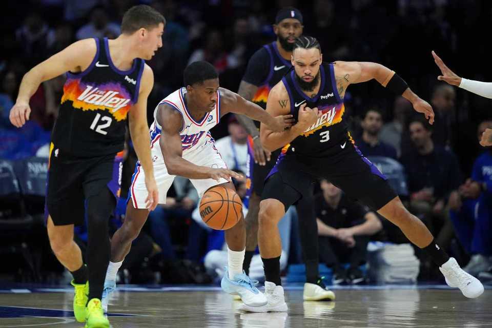 次节比赛,太阳进攻火力提升首次单节30分,且限制76人首次单节不足25分。太阳被拉开29-34落后,太阳内外开花一波12-2攻势反超5分,76人回敬一波7-0攻势夺回领先。太阳内外开花重新以46-45反超比分,双方之后持续紧咬比分缠斗至53-53,太阳连得4分,太阳单节30-23净胜7分,上半场结束太阳57-53反超76人。前两节比赛,太阳三分15中6,布克13分与伊戈达罗10分;76人三分20中6,埃奇库姆12分与乌布雷16分。
