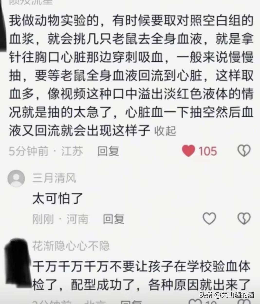 也有从事动物实验的人说我做动物实验的,有时候要取对照空白组的血浆,就会挑几只老鼠去全身血液,就是拿针往胸口心脏那边穿刺吸血,一般来说慢慢抽,要等老鼠全身血液回流到心脏,这样取血多。